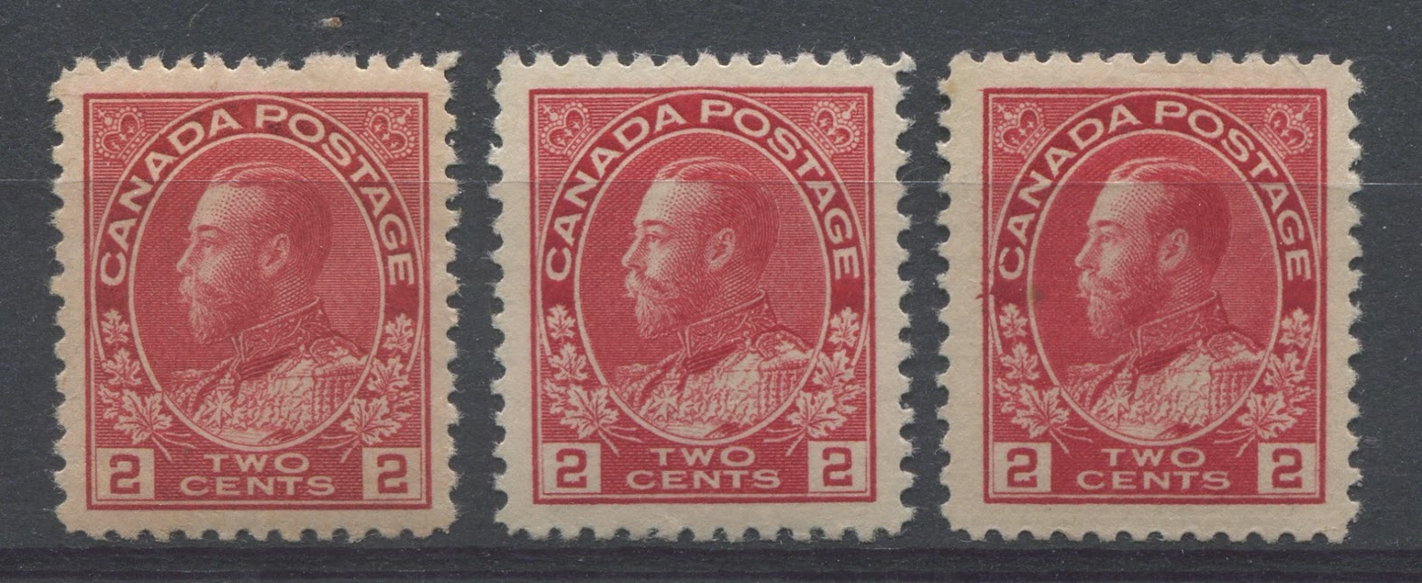 Of all the stamps in the 1911-1928 Admiral Issue, this stamp is the most complicated in terms of the number of shades that can be found. Unitrade makes some attempt to list the broader shade groups. However, as with all carmine or dark red stamps issued before and during World War I from just about any country you care to name, there are a tremendous number of shades. The main reason why there are so many has to do with the fact that the Commonwealth countries relied on Germany for their supply of red dies. When the war broke out in 1914, these supplies were interrupted and the printers were forced to improvise and find alternate sources of dyes. It was this improvisation that led to the largest range of shade varieties in philatelic history.