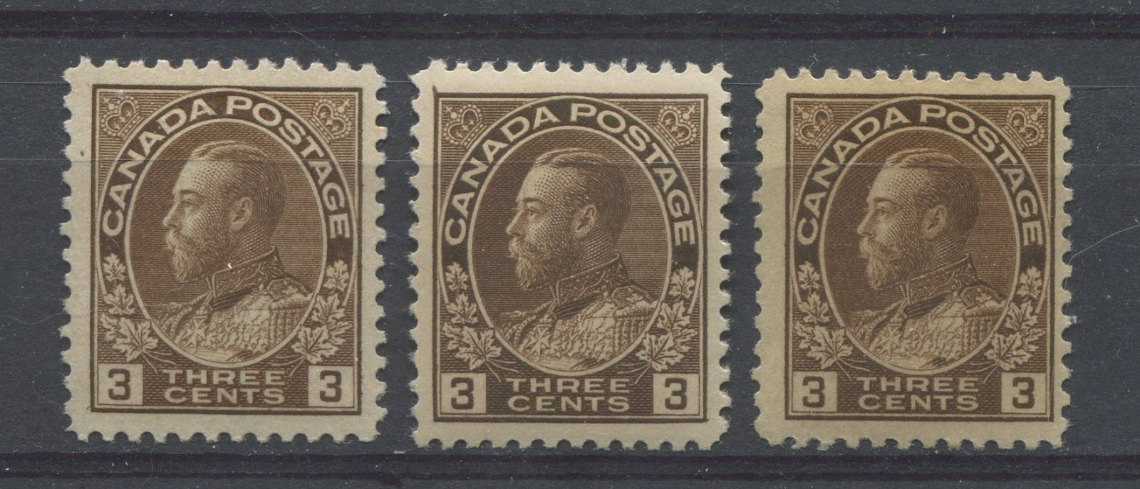 Unitrade's treatment of shades on this stamp is practically non-existent, with only three shades being listed for the sheet stamps: brown, yellow-brown and dark brown. For the coil stamps and the War Tax stamps there are only two listed shades: brown and yellow brown. In reality this stamp has at least as many shades as most other stamps in the set, and although there is some overlap, the shades found on the War Tax stamp, which was issued over a year earlier, are completely different from those found on the regular issue postage stamps. In addition, as we shall see, the Unitrade listed brown shade on the wet printings, is different from the shade found on the dry printings, even though Unitrade calls both "brown"
