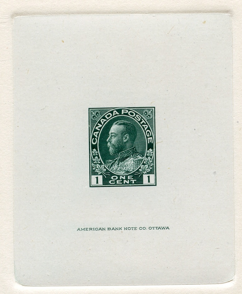 Most early Canadian issues after 1897 have a plethora of proof material to collect and this aspect of most issues is generally the most expensive and challenging. The Admiral Issue of 1911-1928 is no exception. In fact it is especially challenging due to the number of denominations in the set and also the number of colours that were issued during its life. The BNA Proofs website gives a comprehensive listing of proof material for this issue - 73 items in all. The website gives estimated market values that cover an extremely wide range from as low as $500 for some of the trial colour proofs, up to $20,000 for the composite dies of the 1c. Most items however are estimated in the $2,000-$5,000 range. My intent here is not to copy their work, but to give you a brief synopsis, and a link where you can go look at their page yourself for more information.