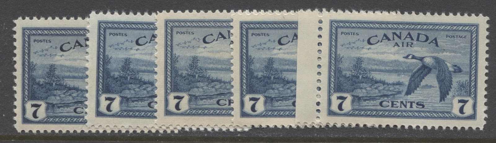 The only stamp from this series to be issued in booklet form was the 7c Canada Goose Airmail, which appeared along with the 1c, 2c, 3c and 4c War Issue stamps in a special Christmas gift booklet that was released in 1947. The 7c airmail stamp was printed in panes of 4 stamps for inclusion in this booklet. There may be some variation in the shades, paper and gum.