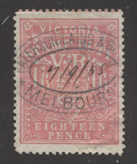 A postal fiscal is a revenue stamp that was authorized for a period of time to be used for postage. Victoria and most of the other Australian states prior to 1901 and New Zealand both authorized many of their revenue stamps for postal use. Most used examples that are found in collections, such as the one shown above do not show evidence of postal use, but rather are simply used as revenue stamps, in which case they are much more common than the catalogue prices would suggest, and consequently are worth much less.