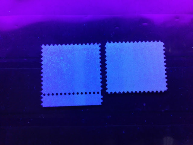 The paper fluorescence found on these stamps is exactly the same as that found on the Winnipeg tagged stamps with PVA gum on the MF-fl paper. This fact suggests that both papers were in use concurrently, and one does not pre-date the other. The picture below shows the difference on these stamps: