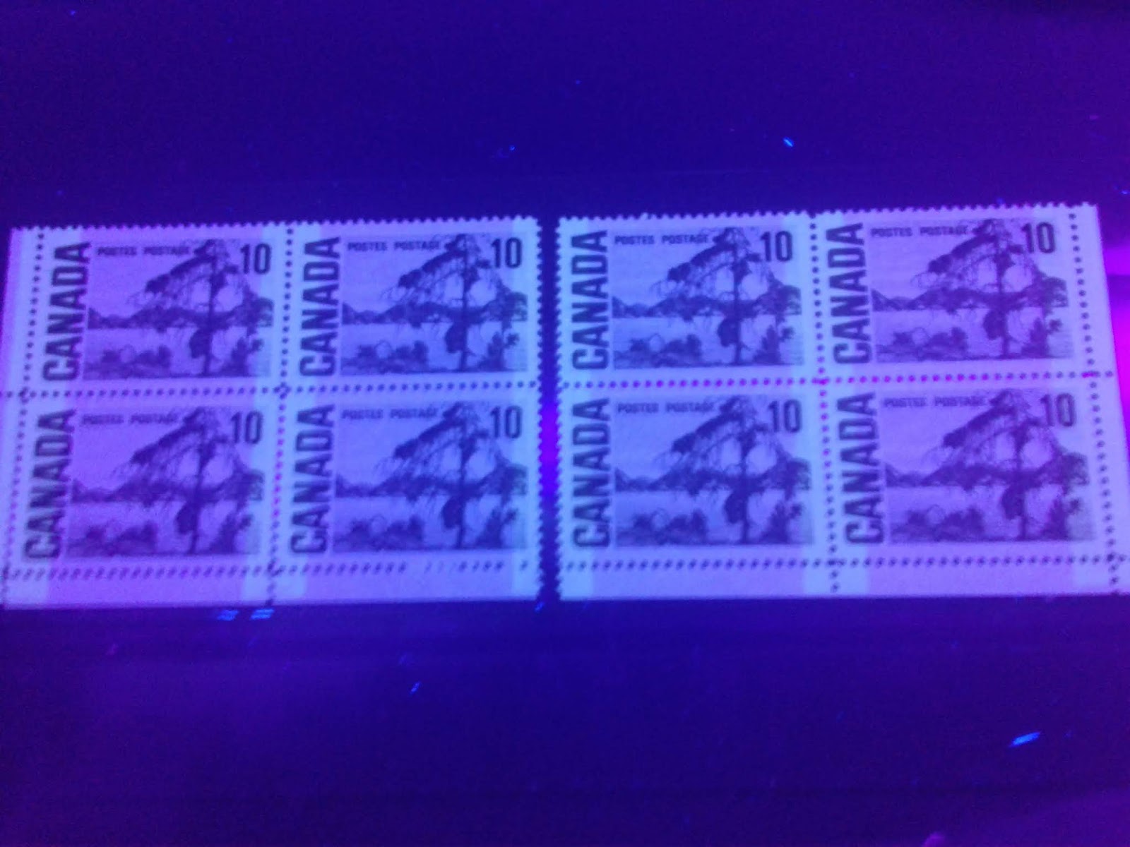 These first two blocks appear a dull fluorescent greyish colour with a yellowish undertone under UV - not quite as dark as they appear in the picture above. The block on the left contains very few medium fluorescent fibres, while the one on the right contains very few low, medium, high fluorescent and hibrite fibres. You can just see the brighter of these if you concentrate in the area of the selvage between the inscription and the word "Canada" of the lower left stamp in the block.